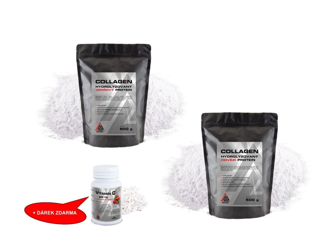 AKCE Collagen Hovězí a Vepřový VALKNUT 2x500 g + Vitamin C s šípkem 60 kapslí zdarma